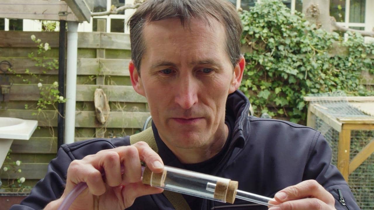Een inspecteur komt langs bij de bewoner en kijkt overal in de tuin voor eventuele muggen.